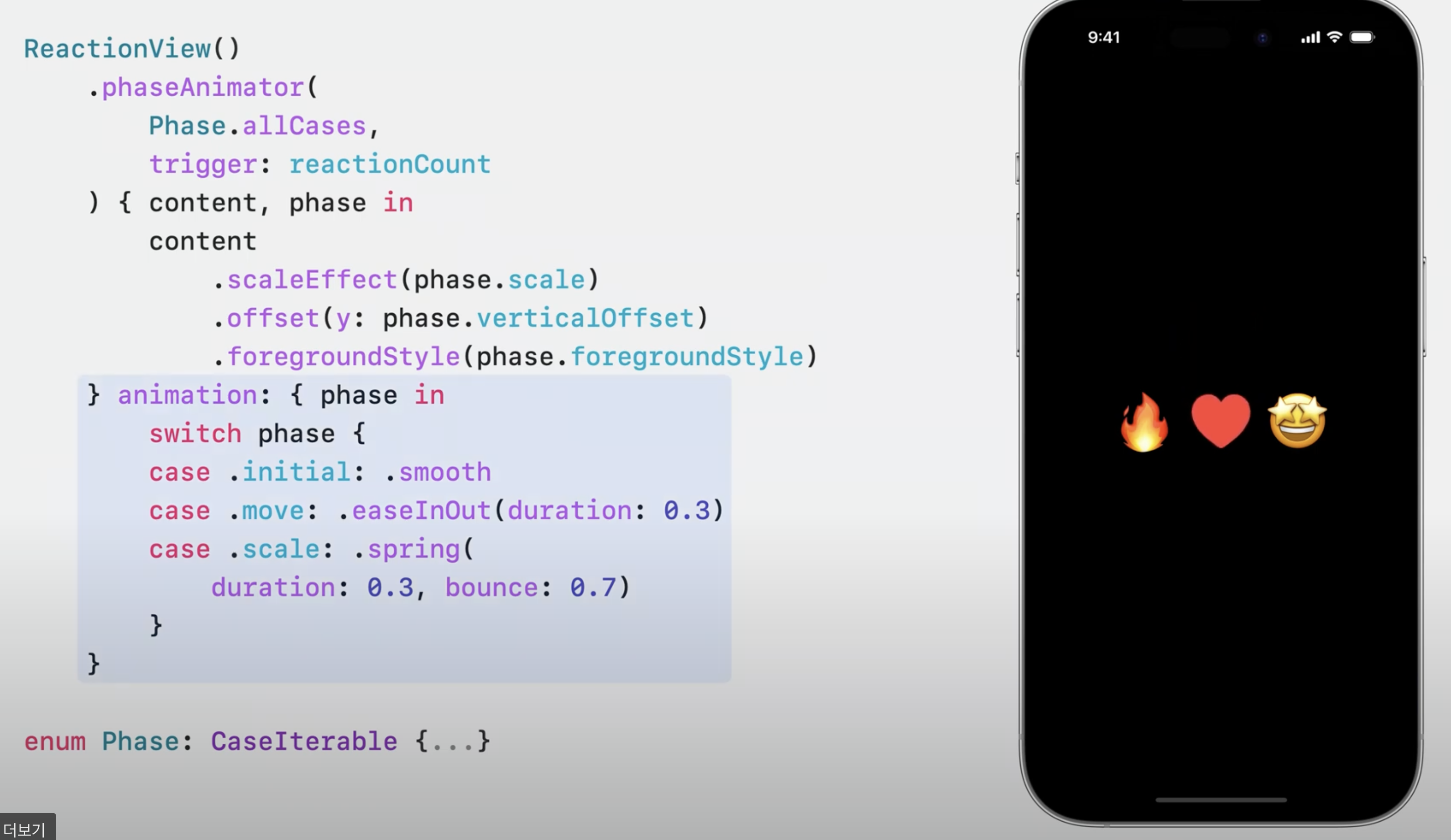 여기서 animation 클로저 내부에 전달되는 phase는 뷰의 개별 상태를 정의하며, SwiftUI는 상태 사이의 애니메이션을 기존의 animation 뷰 수정자에서 전달받은 phase 인자값을 활용해 각 페이즈마다 다른 애니메이션 유형을 지정한 것도 확인할 수 있습니다.