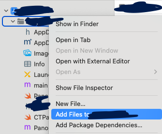 깃허브 레포 기준 Source 폴더 내부에 있는 CTPanoramaView.swift 파일을 그대로 {프로젝트 루트}/ios 폴더 내부로 이동시킨 후, XCode에 들어가 Add Files to 프로젝트명 을 실행하여 Xcode 내부에서도 해당 파일을 참조할 수 있도록 연결해준다. 이때, 최상단 프로젝트 디렉토리가(파란색)가 아닌, 그룹 프로젝트 디렉토리(회색)에서 우클릭하여 파일을 추가하도록 하자. 이는 앞으로 파일을 추가하거나 생성할때에도 동일하다.