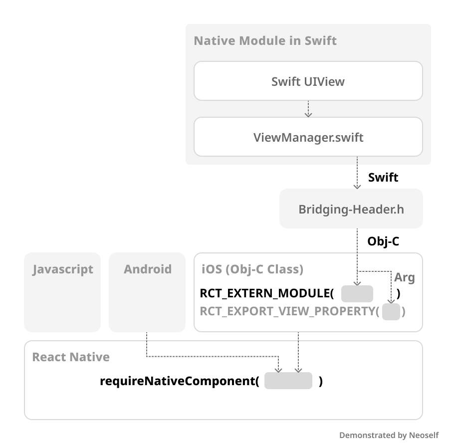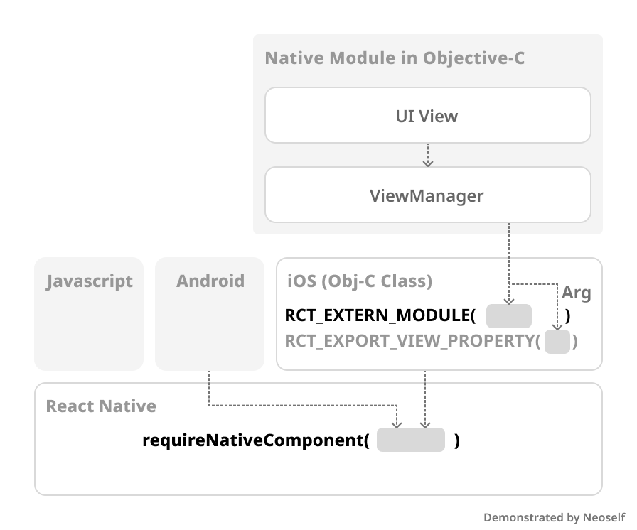 네이티브 UI뷰 파일이 React Native에 렌더되기까지 일반적으로 필요한 파일 구성은 다음과 같이 도식화 해볼 수 있다.