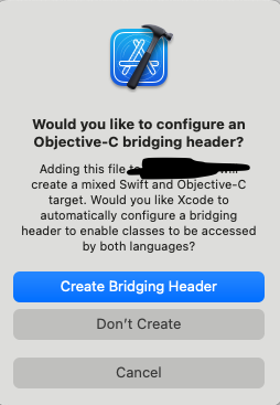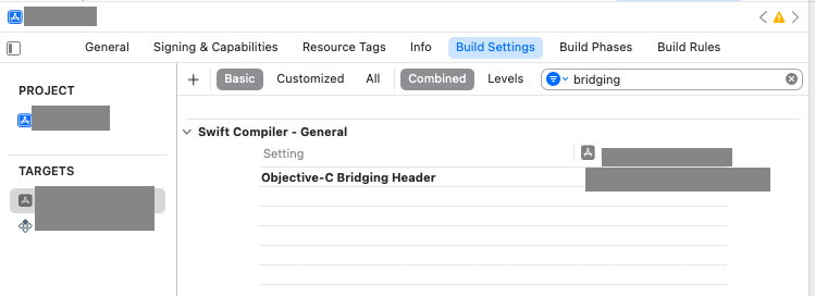 물론 팝업창을 통해 파일을 생성하지 않아도, 나중에 Header File 유형 파일을 새로 생성하여 Bridging-header 파일을 생성하여도 된다. 하지만 이의 경우 Xcode에서 매번 파일을 추가해 참조를 해주는 것처럼, Xcode의 Build Setting 탭 내부 Objective-C Bridging Header 설정에 추가한 파일명을 그대로 입력해 등록해주는 절차가 필요하다. 설령 프로젝트 이름이 exampleApp이면