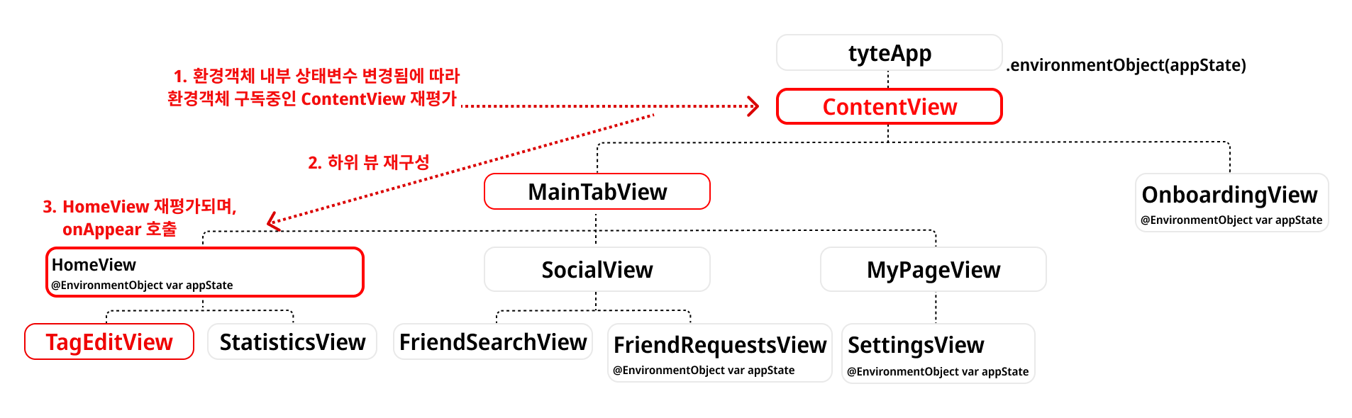 - AppState를 구독하고 있는 ContentView가 재평가됨에 따라, 전체 View 계층 재구성