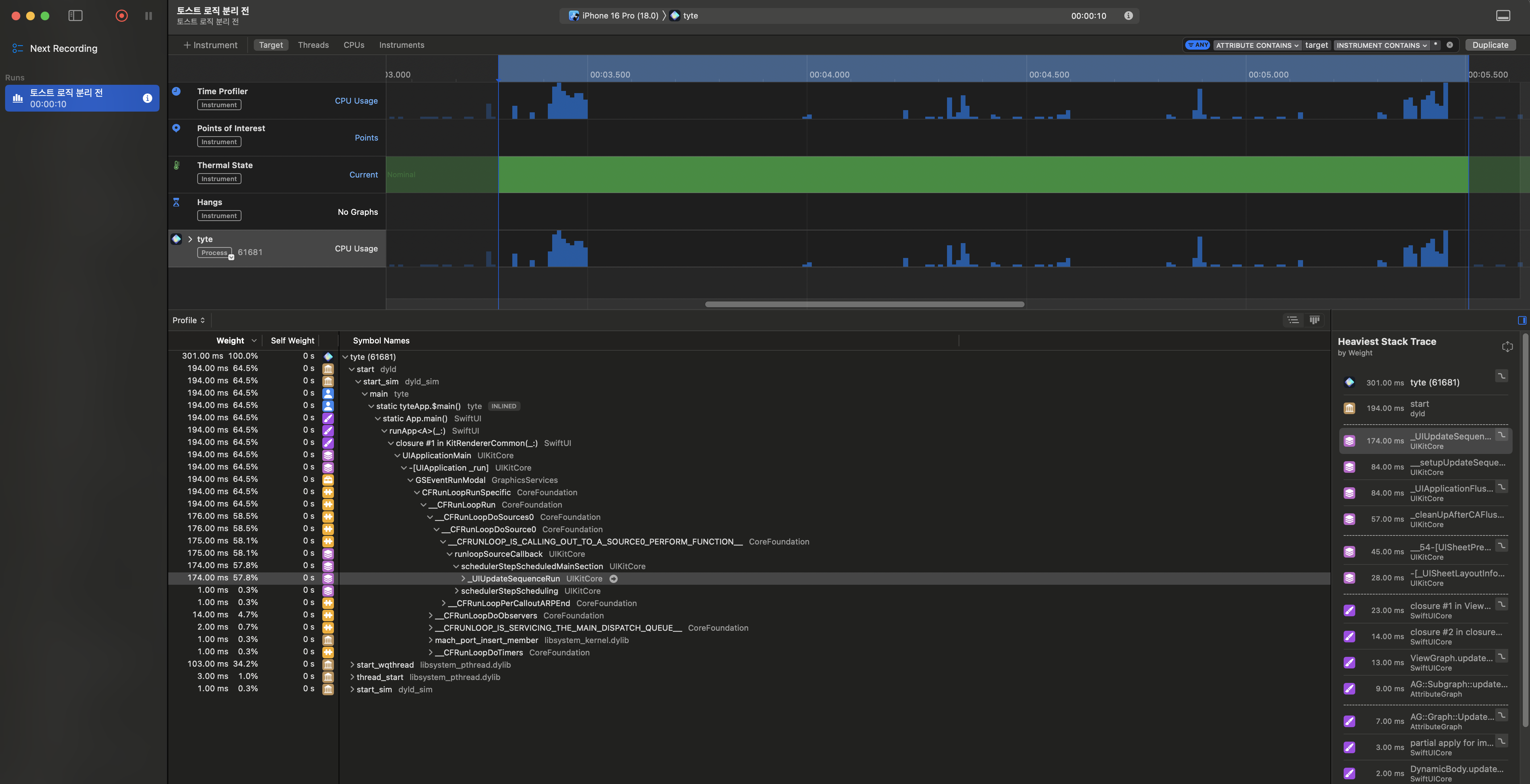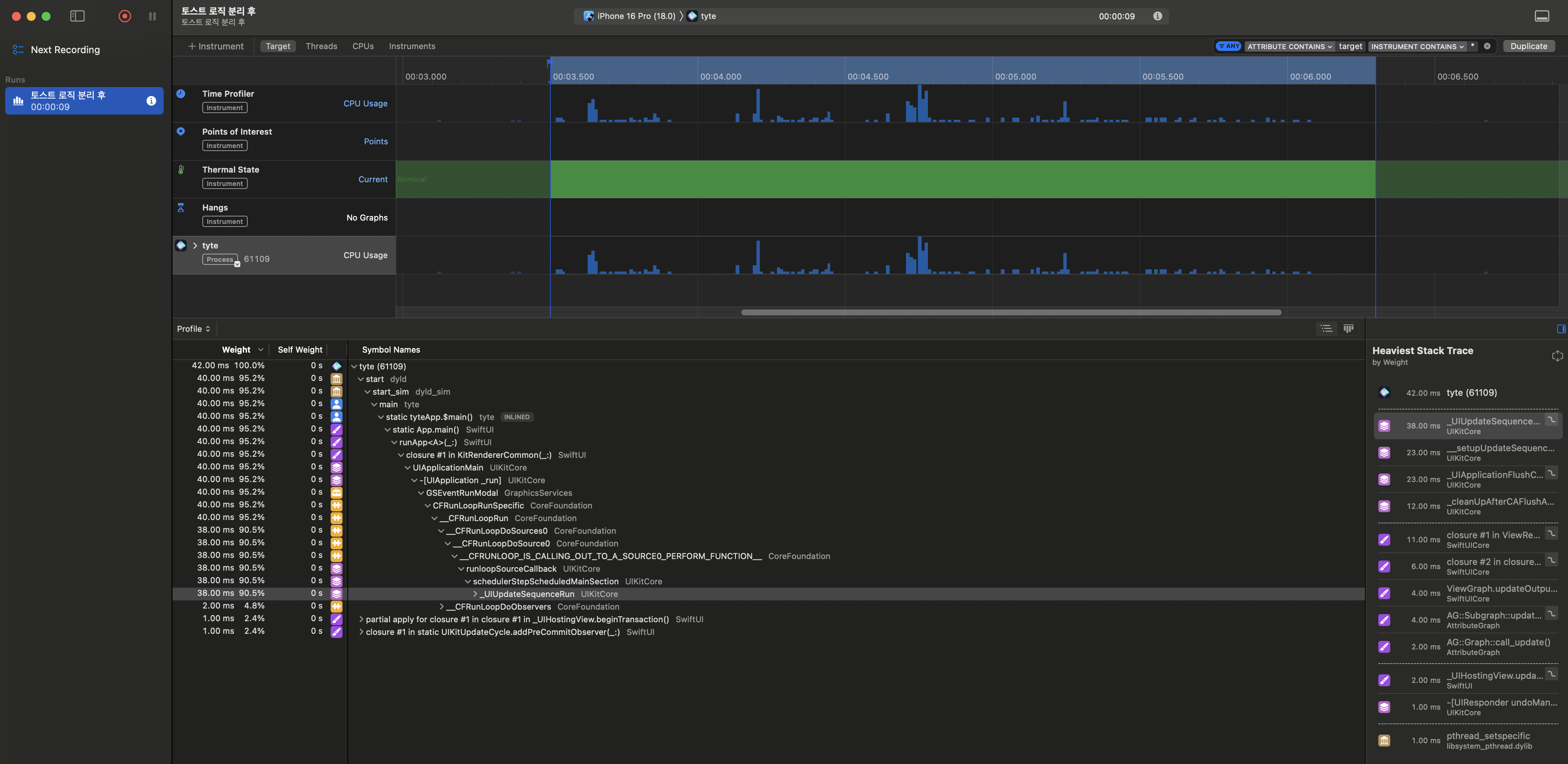 로딩 인디케이터가 표시된 이후, 다른 상호작용에 의한 뷰업데이트가 진행되지 않았던 것을 미루어 보았을때, UI 업데이트를 책임지는 메인쓰레드를 다른 작업이 항시 점유하고 있다는 것을 예상해볼 수 있었습니다. 따라서 XCode에서 제공하는 Instrument 도구의 Time Profiler 기능을 활용해 메인쓰레드를 점유하는 작업이 무엇인지 프로파일링해보았습니다.