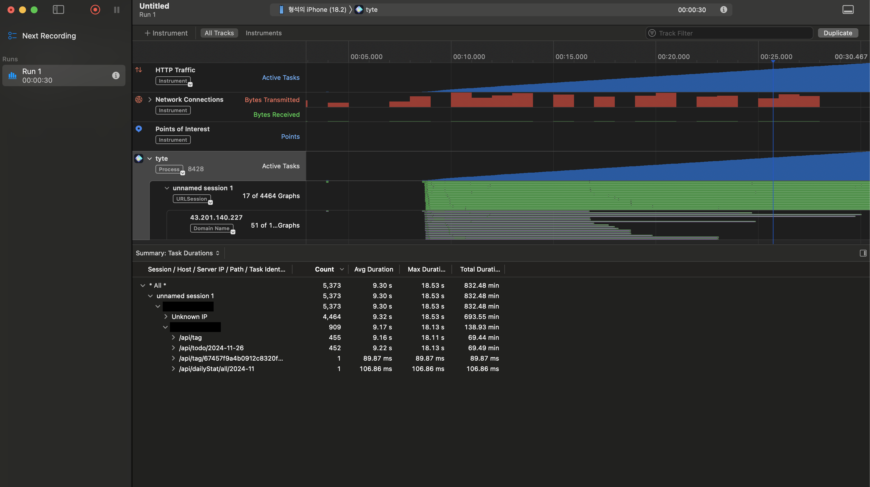 그 다음에 제가 취한 접근 방향은 실행된 비동기 작업을 중심으로 방향을 좁혀보는 것이였습니다. 이를 위해 저는 Instrument의 Network 기능을 활용해 뷰의 무한재구성이 발생할때, 앱에서 어떤 네트워크 통신을 하는지 프로파일링 해보았습니다.