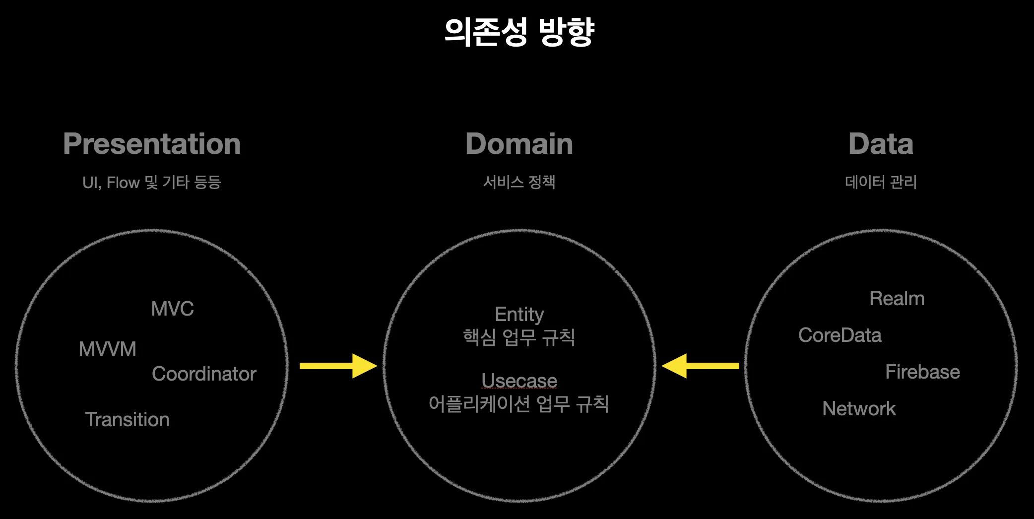 이러한 문제들을 해결하기 위해 Clean Architecture를 도입했습니다. 모바일 개발환경에서 Clean Architecture는 세 개의 주요 레이어로 구성됩니다:
