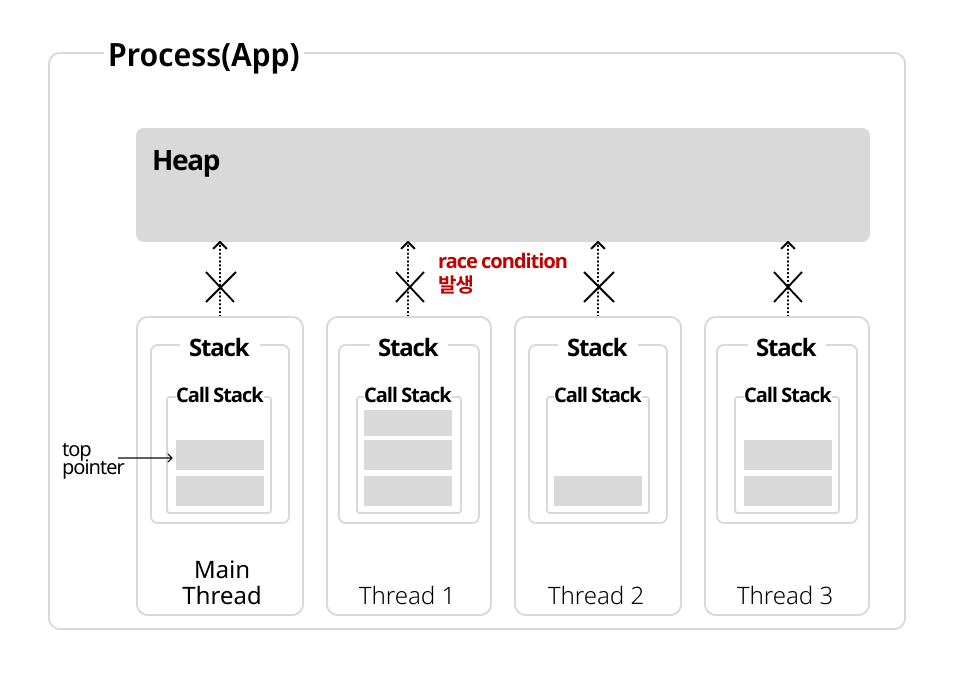 때문에, 멀티-스레드 환경의 경우, 두개 이상의 스레드에서 힙 메모리를 접근해야하는 상황이 발생합니다. 힙 내부에 있는 데이터를 접근해 Read하는 과정에서는 데이터 변경이 이루어지지 않기 때문에, 문제가 발생하지 않지만, Write 작업과 같이 메모리 할당작업을 하게 될 경우, 접근 순서에 따라 결과가 달라지는 Race Condition이 발생합니다. 이를테면 2개 스레드에서 동시에 동일한 힙 메모리 주소에 데이터 저장 작업을 수행하면 덮어씌워지는 상황이 있겠죠.