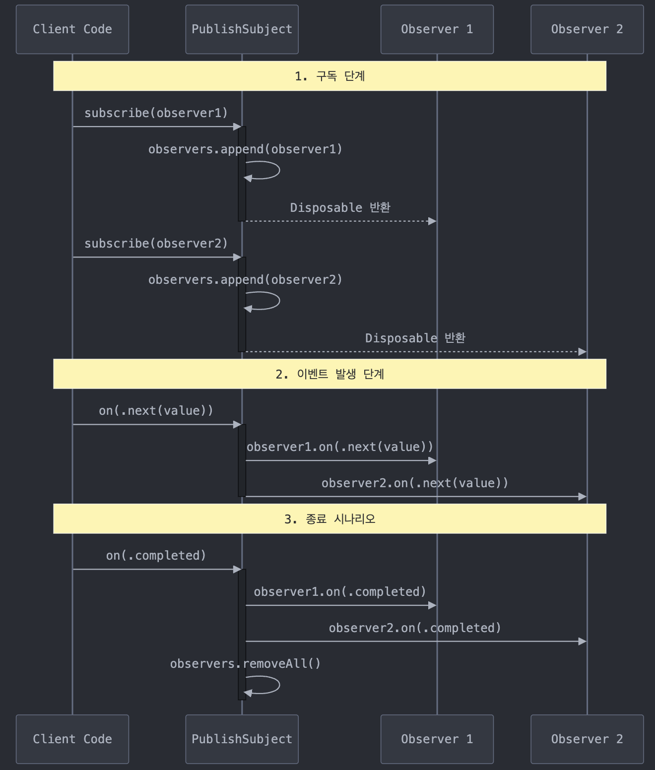 RxSwift는 ReactiveX 프로그래밍 패러다임을 Swift로 구현한 라이브러리입니다. 이 글에서는 RxSwift의 핵심 컴포넌트들이 어떻게 상호작용하며 동작하는지 실제 소스 코드를 통해 살펴보겠습니다.