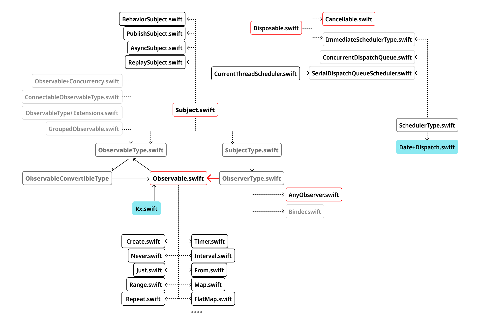 아래 사진은 RxSwift 라이브러리의 내부 구현파일들의 의존성을 표현한 그래프입니다. 해당글을 통해 다루게 되는 파일들은 검정색 및 빨간색 줄처리하였습니다.