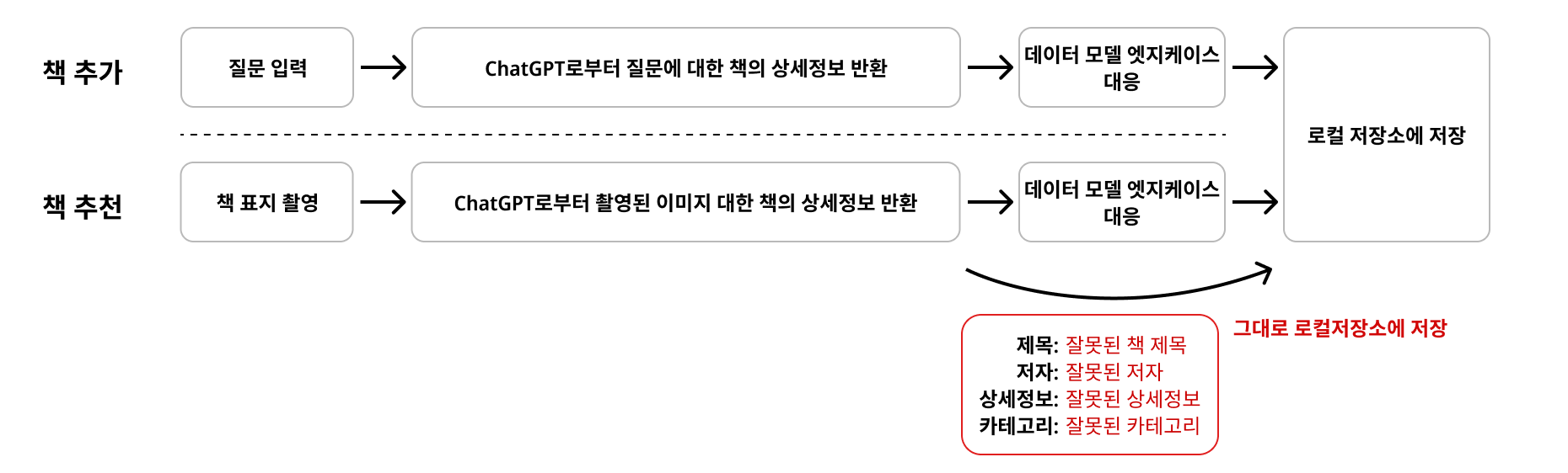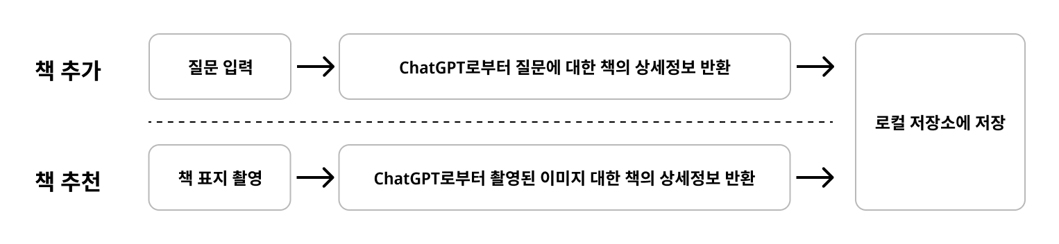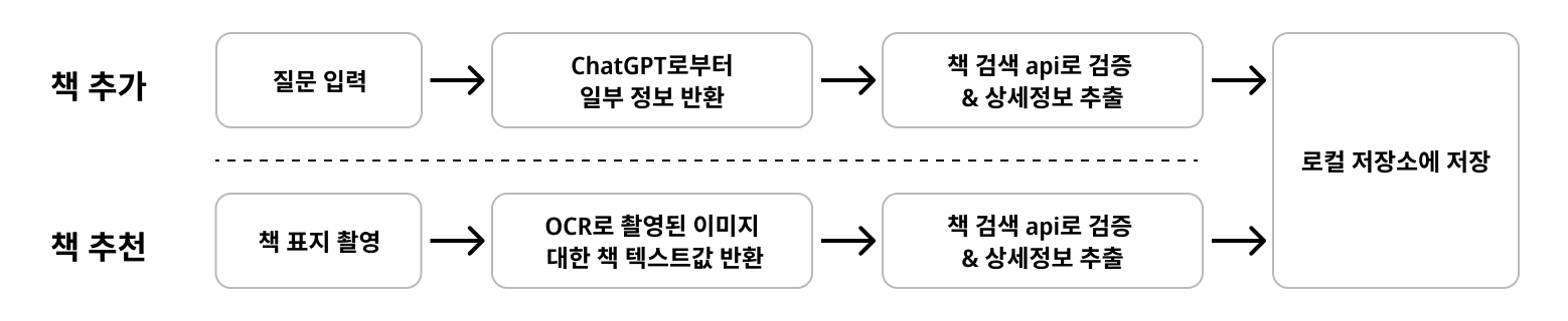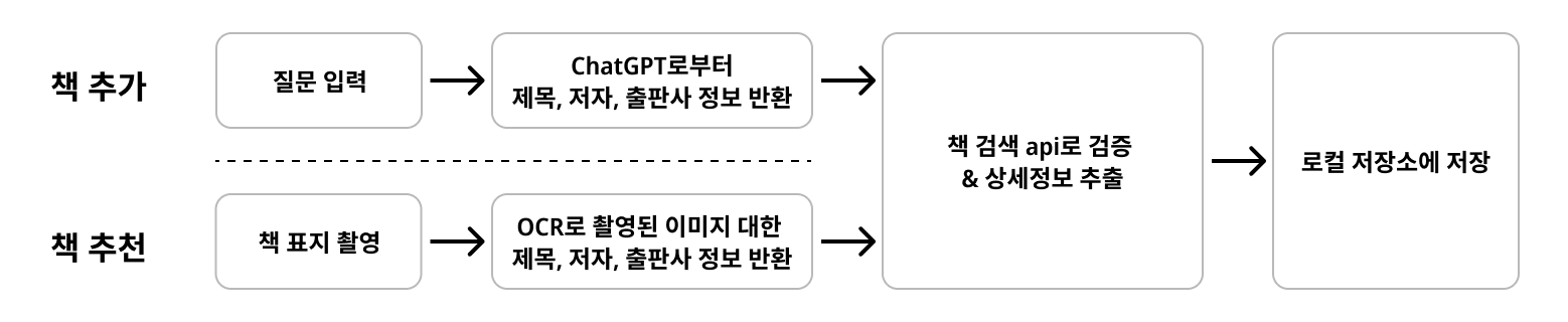 따라서, 위 방향에 맞춰 책 추천 및 책 추가 플로우를 아래와 같이 구체화해볼 수 있었습니다.