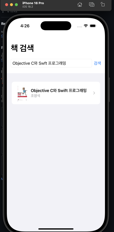 선정 이후, 바로 네이버 책 검색 api를 사용하는 책 검색 데모 앱을 제작해 동작여부를 테스트해보았는데요. 그 과정에서 흥미롭게도 Swift에 i가 누락된 상태로 기입해도 의도했던 제목의 책이 반환되는 것을 볼 수 있습니다.