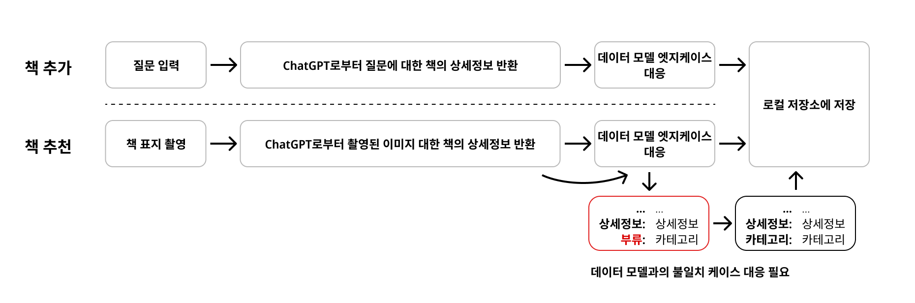 책 추가와 책 추천의 플로우를 비교해보았을때, 데이터를 추가하는 방식은 상이하지만, 결국 책 검색 api의 검색값에 대입할 수 있는 텍스트를 추출한 후, 책 검색 api로 검증해 api가 반환하는 데이터모델을 최종모델로 사용한다는 점에서 일부 로직들이 공유될 수 있다는 것을 확인할 수 있었습니다.
