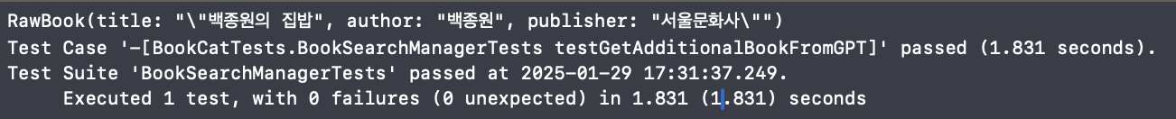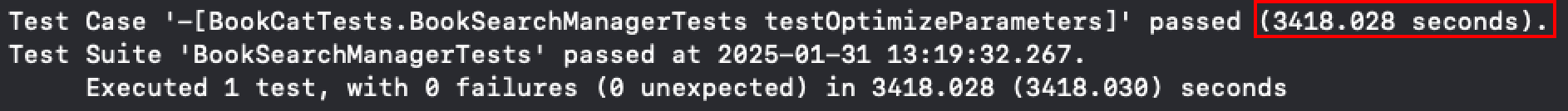 보시면 모든 테스트를 종료하기까지 약 56분의 시간이 소요된 것을 확인하실 수 있는데요. 이는 도서 매칭 과정 간에 발생하는 api호출 횟수, 그리고 속도제한 초과 에러를 방지하기 위해 api 호출 간 삽입한 Task.sleep에 의한 소요시간입니다.