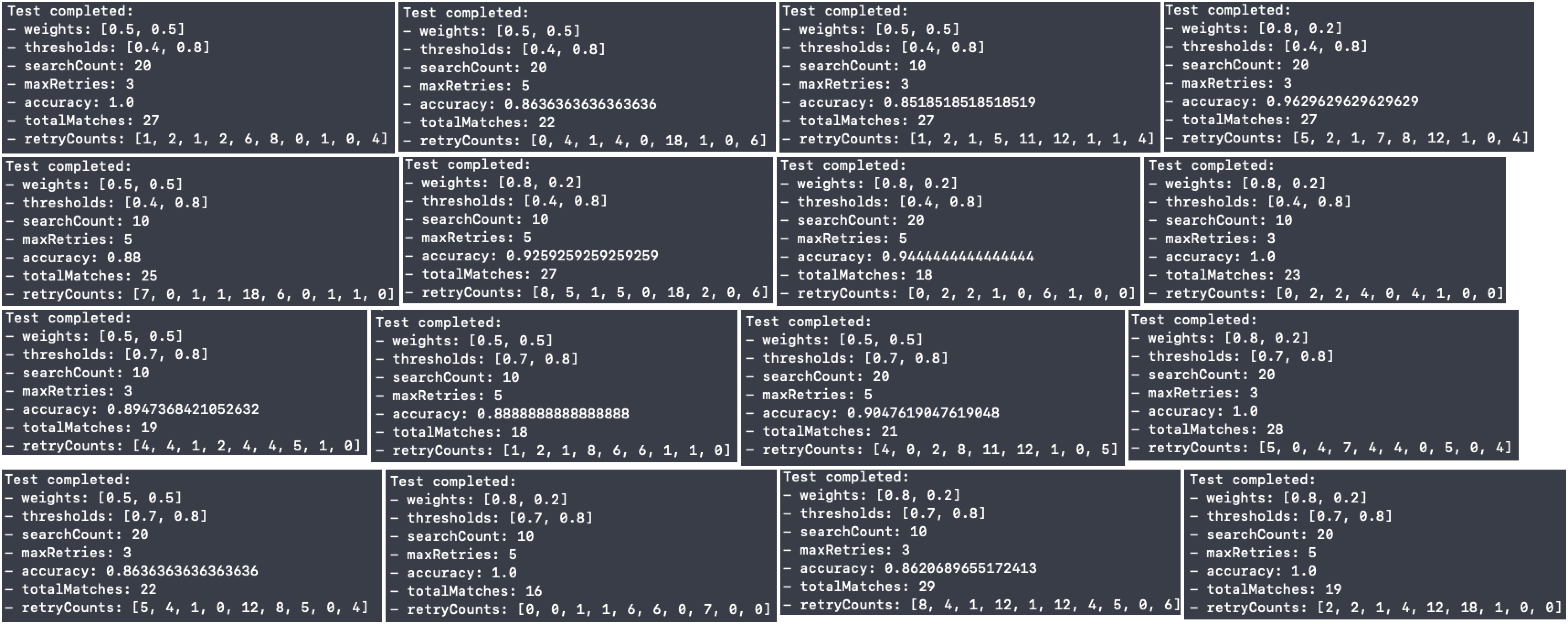 이후 도서매칭 시스템 클래스에 외부로부터 주입되어야하는 변수들에 배리에이션을 두어, 총 16가지 경우의 수에 대해 정확도 측정을 진행하였습니다.