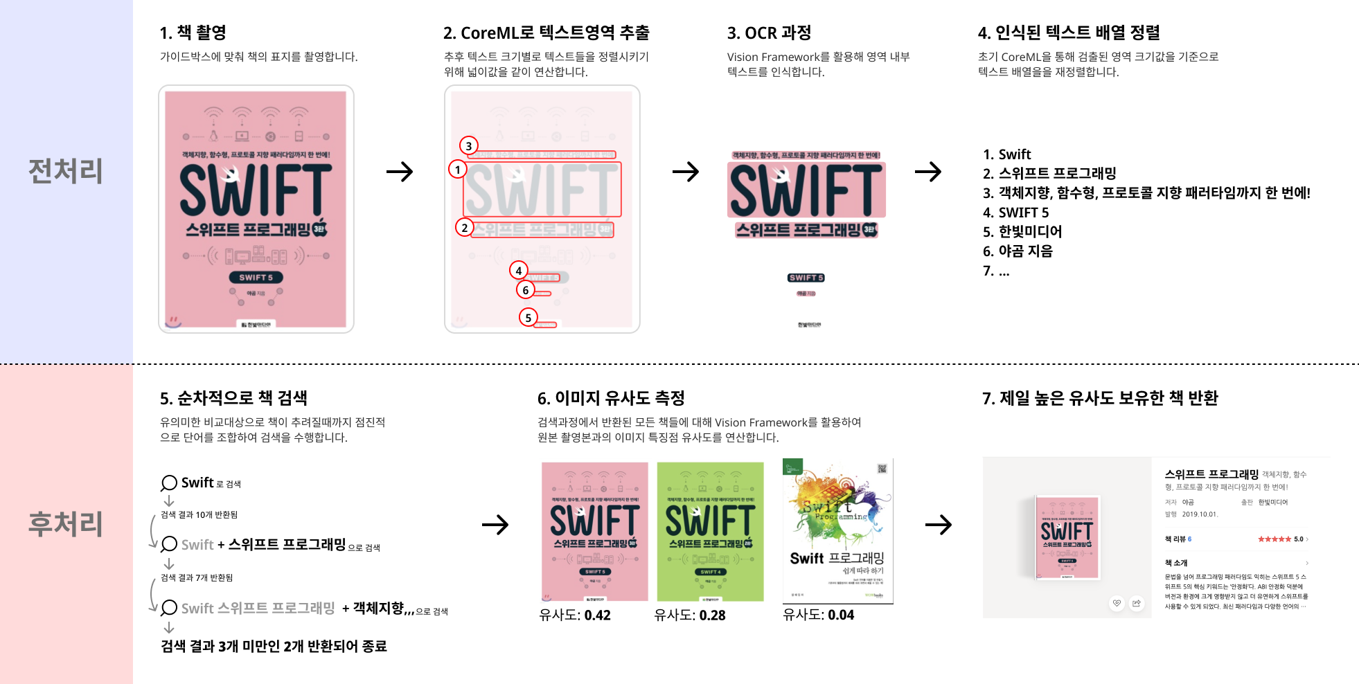 이번 포스트에서는 CoreML과 OCR을 활용한 도서 표지 인식 결과를 기반으로, 실제 도서를 매칭하는 시스템의 후처리 구현 과정을 공유하고자 합니다. 특히, 초기 기획과는 다르게 변경된 설계 과정과 그 과정에서 마주친 문제들을 어떻게 해결했는지 자세히 다루어보겠습니다.