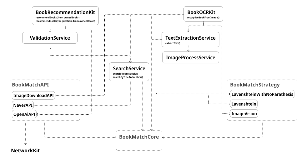 BookSearchService는 BookMatchAPI 모듈 내부에 위치한 반면, ImageProcessService와 TextExtractionService는 BookOCRKit에 위치했으며, BookValidationService는 BookRecommendationKit 내부에 위치했습니다.
