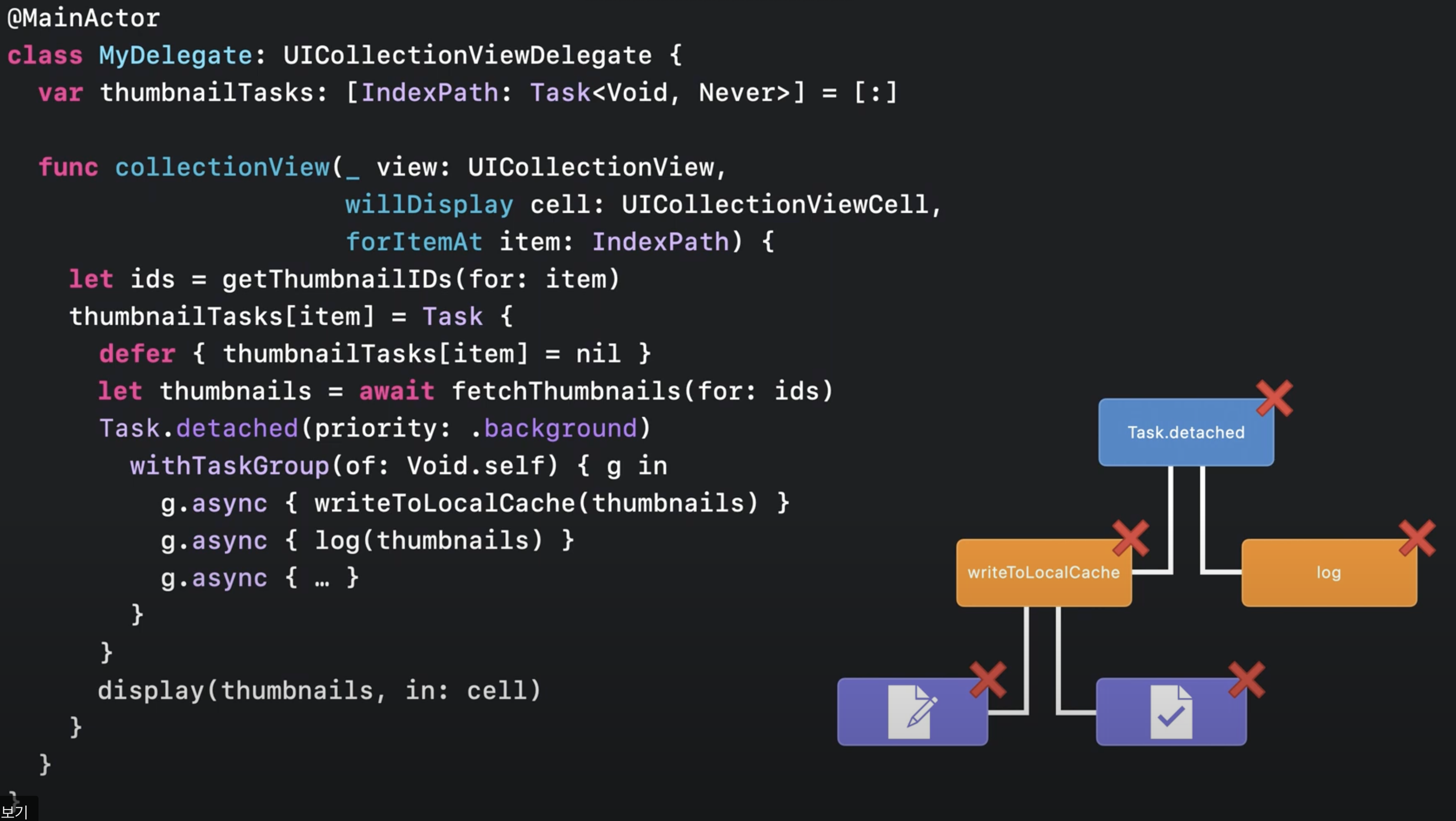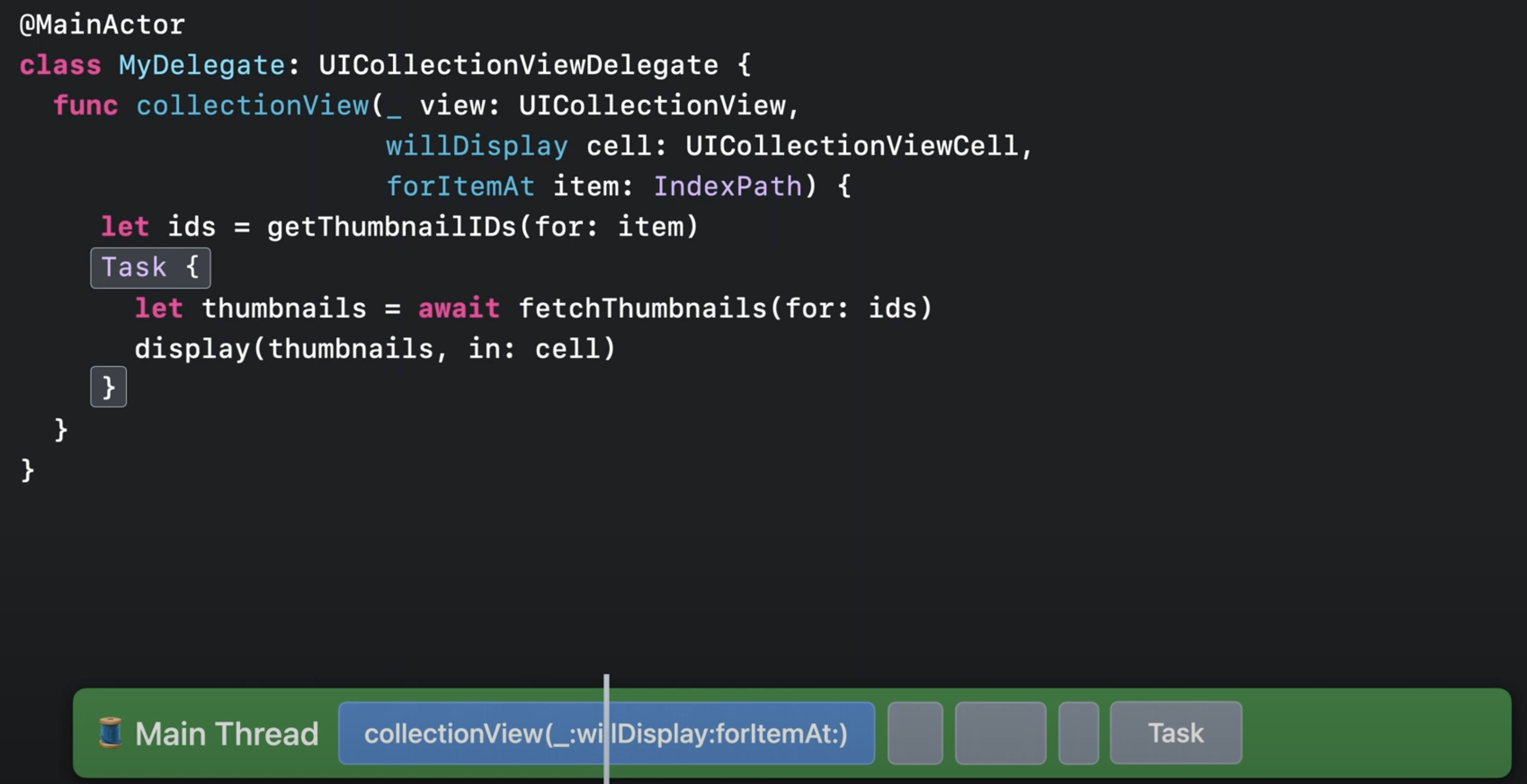 Task 클로저로 비동기 작업을 옮길 경우, 작성 샘성 시점 도달 시 Swift는 해당 작업을 원래 범위와 동일한 액터에서 실행되도록 예약하며, 제어는 호출자에게 반환됩니다. 이후, 썸네일 작업은 실행할 여유가 있을 시점에, 메인스레드에서 실행됩니다.