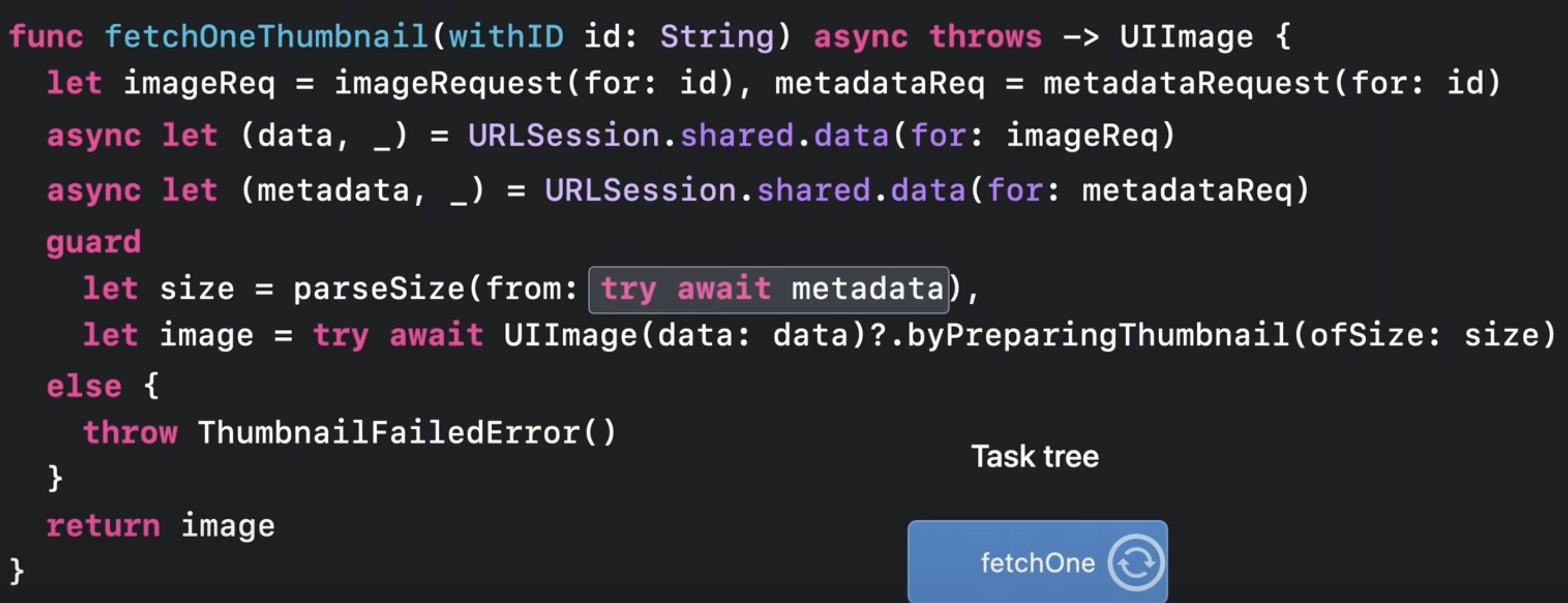 이 코드에서 만일 try await metadata에서 오류를 던지며 완료되면,