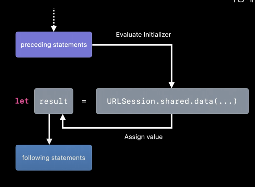 async let 바인딩: 데이터 다운로드 완료 이전까지 다른 작업을 계속 수행할 수 있도록 Concurrent Binding(동시 바인딩)으로 바꿔줌.