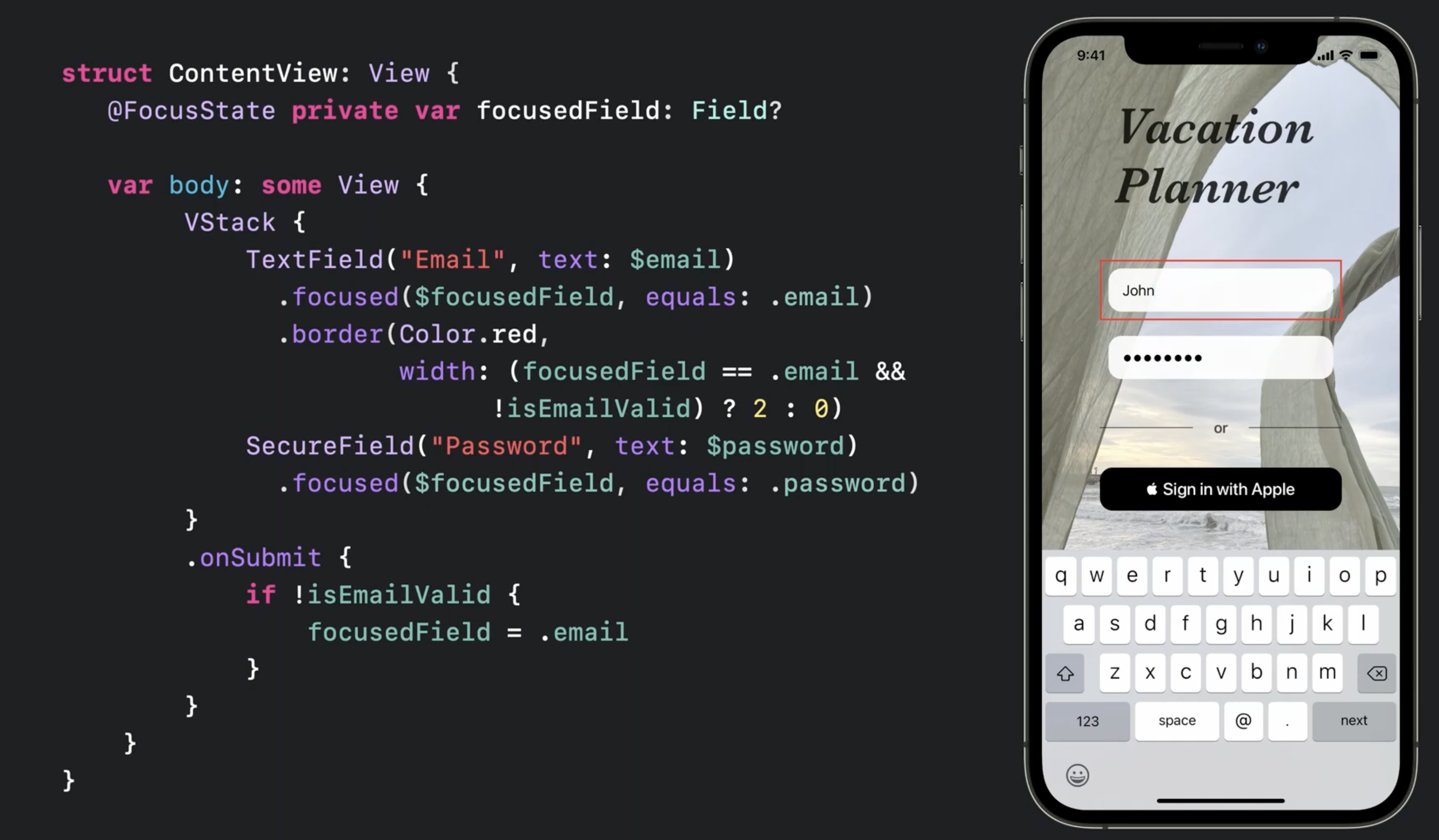 좌측 예시의 경우, 이메일 형식이 올바르지 않으면, focusedField를 .email로 설정하여 이메일 입력 필드로 포커스를 되돌리는 로직이 구현되어있으며, 빨간색 테두리가 표시되는 조건에도 이 focusedField의 상태를 활용합니다.
