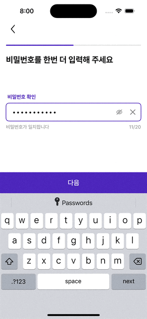 회원가입 플로우에서 사용자가 화면을 터치하지 않고도 키보드의 "다음" 버튼만으로 모든 정보를 순차적으로 입력할 수 있는 UX를 구현하고자 했습니다. 이 과정에서 일반 텍스트 입력, 그리고 비밀번호 입력이 모두 필요했기에, 평문 입력을 위한 TextField와 입력 내용을 점으로 표기해주는 SecureField 간의 자연스러운 전환이 핵심 요구사항이었습니다.