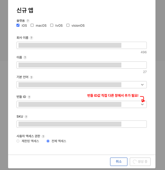 여기서 법인 개발자의 경우 SKU 필드가 추가로 생성되는데, 이는 Apple 내부적으로 사용되지 않고, 앱 개발사(법인)에서 자체적으로 관리용으로 사용하는 식별 코드입니다. 때문에 {회사명}_yyyy_mm과 같이 앱 자체 식별이 가능한 문자열로 설정해두면 좋습니다.