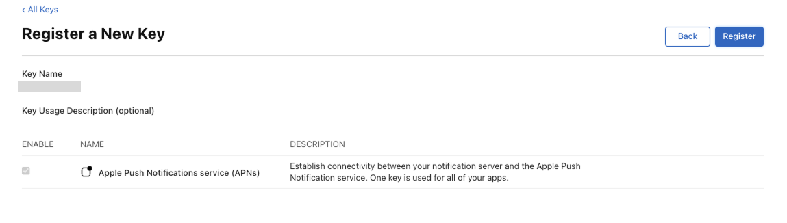 APNs 키(.p8) : 서버용으로 한 번 발급하면 유지 가능 (최대 2개까지 생성 가능)