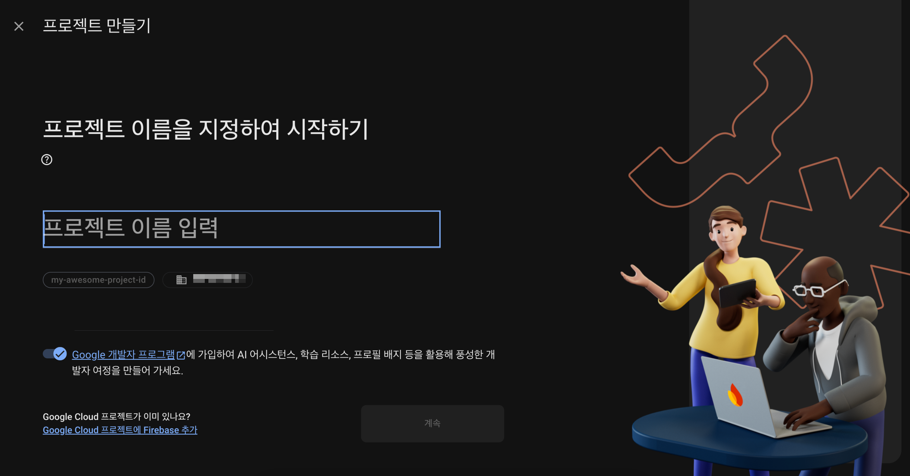 해당 프로젝트 이름은 firebase 플랫폼에서 앱을 식별하기 위해 사용되는 값이기에, 고유한 값을 입력해야합니다. 또한, 한번 설정한 이름은 설정에 사용했던 프로젝트가 삭제되더라도 더이상 사용이 불가하니, 주의에 주의를 가합시다...!