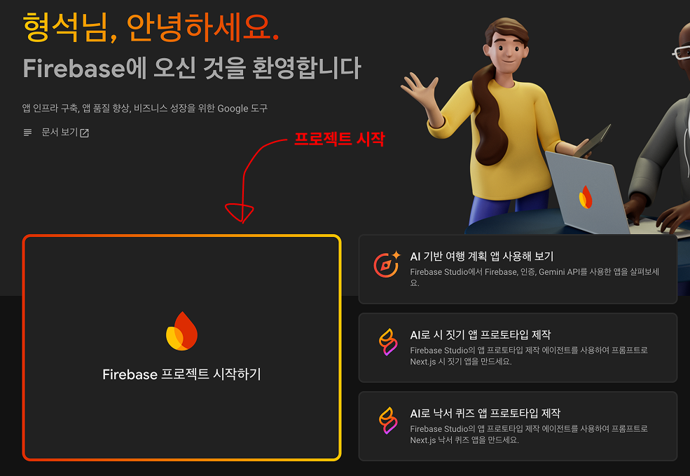 이후, Firebase 콘솔을 접속하여 로그인을 진행합니다.
