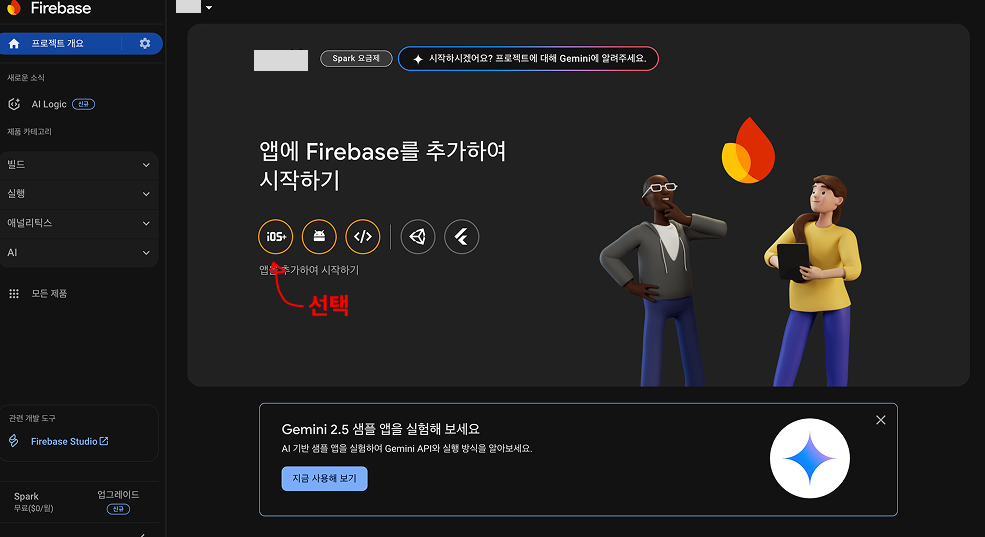 프로젝트 설정 완료 이후에는, iOS 앱을 추가합니다.
